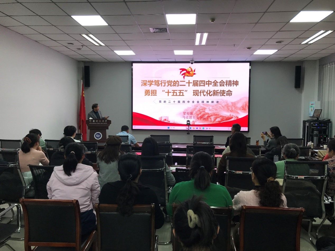 11月20日下午,学院在图书馆527会议室举办“理论讲堂”专题讲座,特邀马克思主义学院梁爱强教授作报告。活动由学院党委书记方传玺主持,学院全体教职工参加。梁爱强教授以《深学笃行党的二十届四中全会精神 勇担 “十五五” 现代化新使命》为题,围绕“锚定历史坐标”、“把握战略指引”、“回望五年答卷”、“权威解读明方向”和“把握核心要义”五大方面,回望了“十四五”期间的历史成就,解读了二十届四中全会精神的核心内...